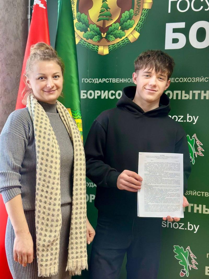 Школьник Матвей Канашевич в присутствии законного представителя (матери) подписал договор с Борисовским опытным лесхозом на обучение по специальности «Лесное хозяйство».